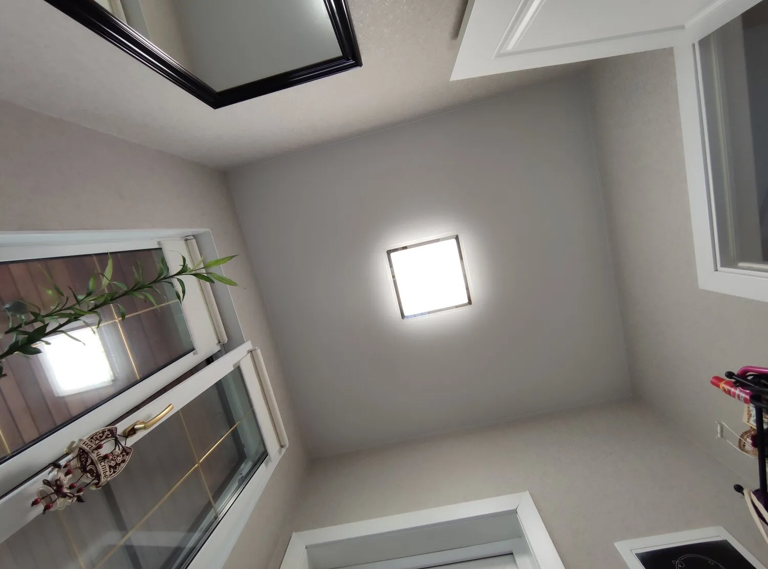 Установили контурный натяжной потолок- после изучения информации решили делать именно так. В качестве материала выбрали глянец, свет красиво отражается и делает комнату визуально больше. По сути это обычный натяжной потолок, но за счёт подсветки выглядит намного современнее и эффектнее.