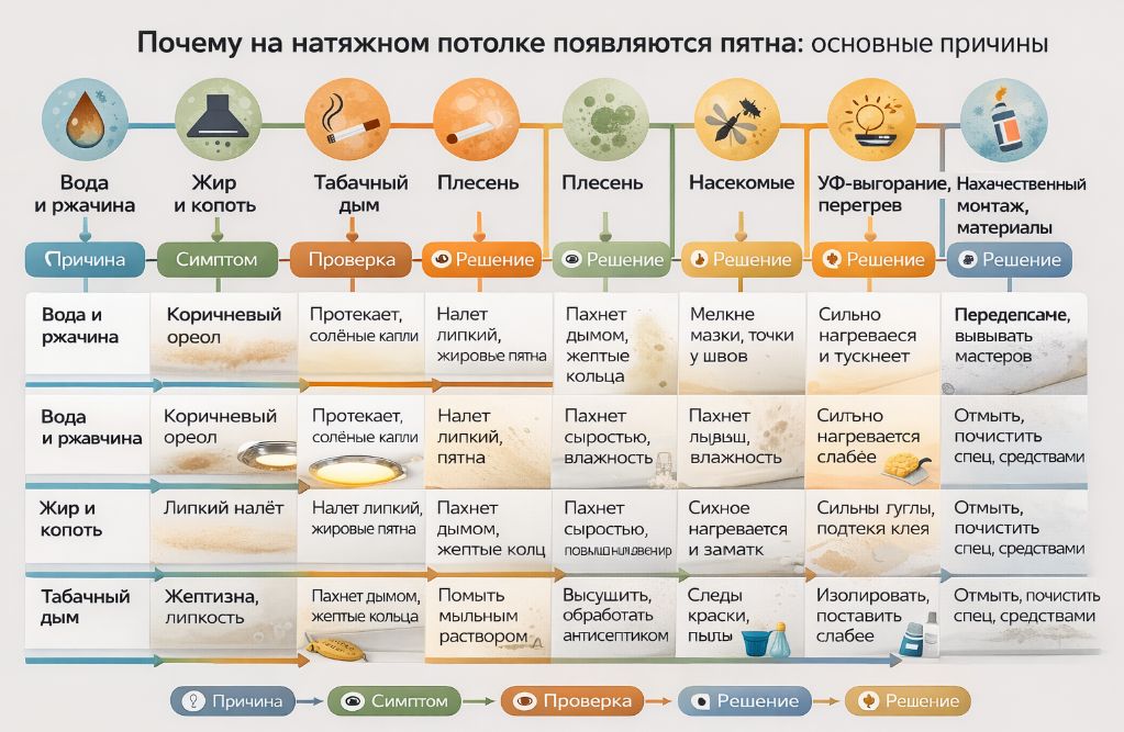 Ключевые причины: вода и ржавчина, кухонный жир и копоть, табачный дым, плесень при отсутствии вентиляции, следы насекомых, УФ-выгорание и перегрев светильников, дефекты монтажа/материалов, а также техногенные загрязнители. Их признаки различимы по цвету, липкости и локализации, что помогает выбрать правильный способ очистки и профилактики.