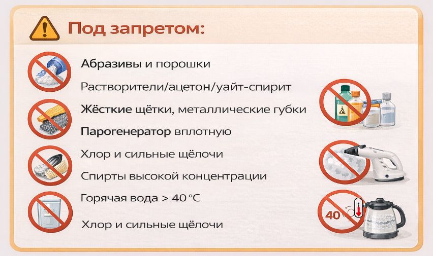 - Мягкая химия pH 6–8: без абразивов, без хлора.